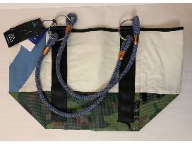 This bag is made with more than 95% upcycled materials with a truck tarp base, sailcloth top, climbing rope handles, and seatbelt webbing.