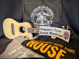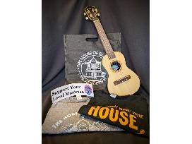 You'll be strummin' on the beach with your new Ukulele from House of Guitars! Plus, sport some swag with two House of Guitars t-shirts (sizes Large and 2XL), a bumper sticker, and a tote bag.