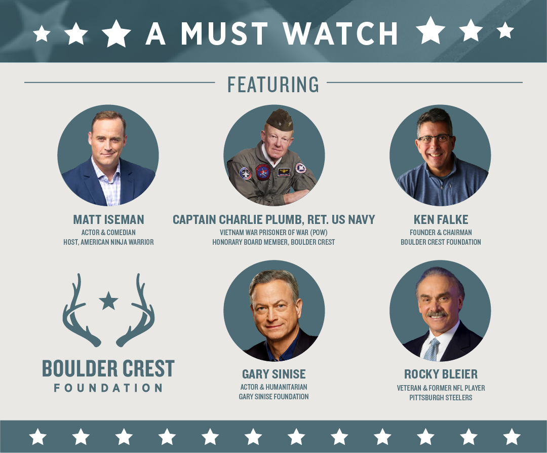 Watch this impactful virtual event hosted by American Ninja Warrior, Matt Iseman, as he interviews former POW Capt. Charlie Plumb, and Boulder Crest Founder and Chairman, Ken Falke. Don't miss additional cameos from Actor Gary Sinise, and veteran and former NFL player, Rocky Bleier.