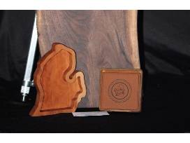 Items from Crimson Oak Wood Company. Large board too pretty to hide. Perfect for serving cheeses, breads, or small appetizers. A great smelling soy candle, coaster set, and wooden Michigan dish completes the set. Take your entertaining or cozy night at home to the next level with these items from Crimson Oak Wood Co.