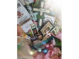 Vintage dresser set with desk, chair, side table and headboard with full queen bedspread set. Pink chenille pillow. Cute vintage Rudolph pillow. Lenox tea set with certificate. with tea from Dublin and pink gold tea stand. Gold rimmed mint tea cups and plates. Cute Baby vintage deer. A gift basket filled sweets and treats, shipped over from Ireland. Womens pink hand knitted merino wool poncho. Vintage Jameson sign with flask and Irish whiskey. Carolans Irish Cream gift set. Welcome Irish sign pink cake glass cake stand. Pink and mint coffee mugs.