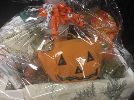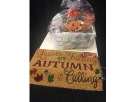 Celebrate fall with this basket: Outdoor harvest rug, Blue pumpkin table runner, Pumpkin candle, Multi-color Sherpa Fall blanket, Martha Stewart Apron, Martha Stewart Gather Together Sign, Bottle of Wine, 2 wine glasses, pumpkin wine stopper, 2 decorative pumpkins from Mud Pie Co, large bag of fall flavored taffy, large white crate.