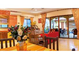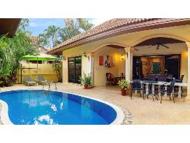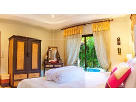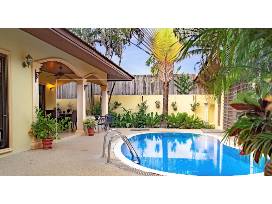 Beautifully furnished and decorated, outside the turquoise pool is fringed by coconut trees and overhanging fan palms helping you feel at one with nature and making a perfect setting for some poolside fun. A shaded alfresco dining patio overlooks the pool and the open-plan living room is bright and spacious with quality furniture and full-width sliding doors opening out to the pool and the kitchen comes well equipped with appliances and utensils.