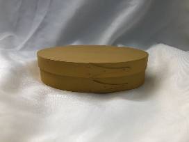 Add a unique piece of American to your home with this Shaker style box from the Enfield Shaker Museum. Known for their quality and precision, the Shakers were masters of their craft. This yellow, oval shaped box measuring approximately 7.5"L x 4.5"w x 2"h is no exception, and exemplifies the simplet perfection found that is the Shaker style.