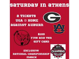 This item is PRICELESS for a UGA fan! Enjoy a Saturday in Athens, wearing exclusive National Championship merch! Enjoy a delicious meal at Five and Ten before heading to Sanford Stadium to cheer on the Dawgs as they take on the Auburn Tigers!