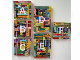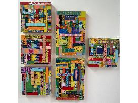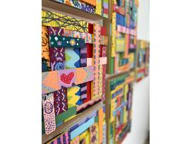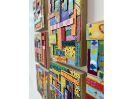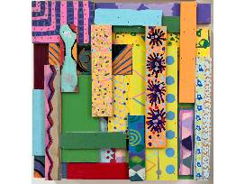 6 pieces collaboratively done by our 3rd graders. Each student embellished painted wood strips with colorful patterns and designs and then parent volunteer assembled them into these super fun, folk-art inspired works on panel. There are 4 @ 12" x 12" and 2 @ 18" x 12". They can work well as pairs/series or as singletons.