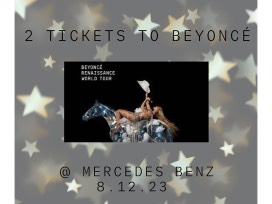 2 tickets to see the SOLD OUT Beyonce Renaissance World Tour show on Saturday August 12, 2023 at 7pm at Mercedes Benz Stadium. Seats are in section 107, Row 16, seats 15-16.
