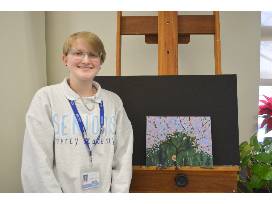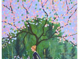A painting of a colorful flowering tree with a confident Mercy student walking strong and with ease. Painting measures 11x14 and is done with acrylics. Artist: Rebecca Reccius '22