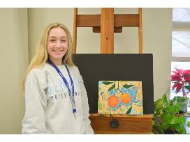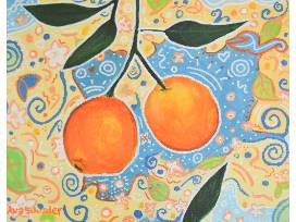 A mixed media artwork of playful oranges. Painting measures 11x14 and is done with acrylics and paint pen. Artist: Ava Shrader '22