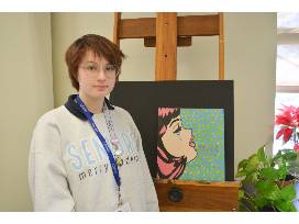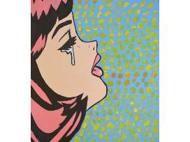 A pop art painting style in blues & pinks of the silhouette of a woman's face. Painting measures 12.5x14 and is done in acrylics. Artist: Lizzy Brothers '22