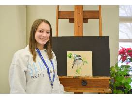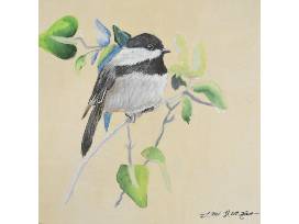 A delightful painting on birch wood of a chickadee perched on a branch. Painting measures 12x12 and is done in acrylics. Artist: Lexi Hedges '22