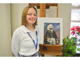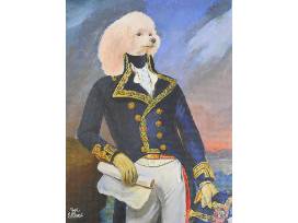 This painting humanizing a dog in French General LaFayatte's uniform inspired by Coolidge's "Dogs Playing Poker". Painting measures 12x16 and is done with acrylics. Artist: Zoe Eckhart '22