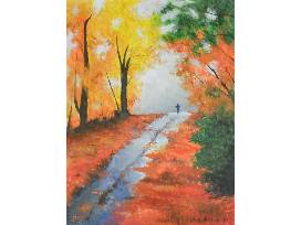 Painting of a person walking down a tree lined fall road. Painting measures 12x16 and is done with acrylics. Artist: Courtney Pohler '22