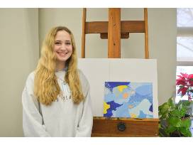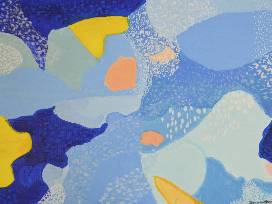 This abstract ocean painting has a playful dance of blues, yellows, peaches, & whites representing the calm of the ocean. Painting measures 12x16 and is done with acrylics and paint pen. Artist: Trinity Bennett '22