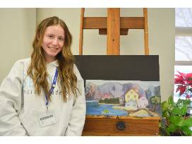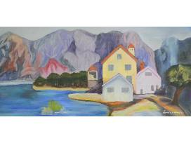 A soft dreamy painting of cottages on the mountainous coastline. Painting measures 12x24 and is done with acrylics. Artist: Brinley Pfeiffer '22