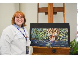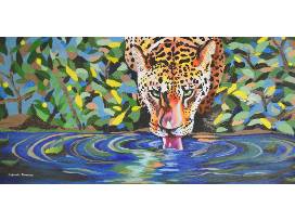 An impasto painting of a jaguar drinking from a stream in the jungle. Painting measures 12x30 and is done with acrylics. Artist: Gabrielle Mattmiller '22