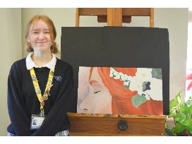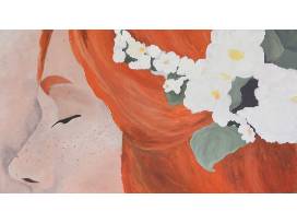 Horizontal up-close painting of a young red-headed woman with flowers. Painting measures 13.5x24 and is done with acrylics. Artist: Lily Swan '23