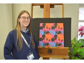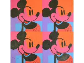 A mixed media pop art presentation of the iconic Mickey Mouse. Painting measures 16x16 and is done with acrylics and paint pen. Artist: Cheyenne Crane '22