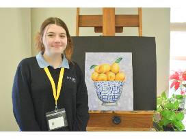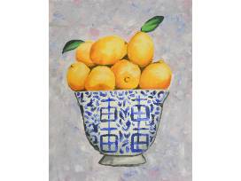 Painting of lemons in blue & white bowl. Painting measures 12x16 and is done with acrylics. Artist: Gabrielle Mayes '23