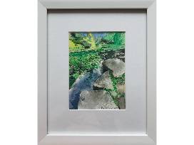 -"Caldwell Lily Pond VI", an original watercolor work by Steve Slaske of Skyline City Prints, depicting a part of the shoreline of the Alfred Caldwell Lily Pool. This piece has been matted and framed to a size of 11"x9"