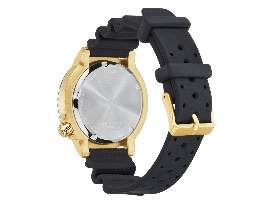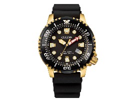 The popular Promaster Dive watch series has been refreshed with new color details. The gold-tone stainless steel case is paired with a black polyurethane strap and a sleek black dial. The hands and markers are both luminous, so you'll be able to see them underwater with ease - the watch is ISO certified for depths up to 200 meters. It features a one-way rotating bezel, and is anti-shock and anti-reflective, making this Citizen dive watch as practical as it is stylish. And the watch is sustainably powered by light with the exclusive Citizen Eco-Drive technology, so there are no worries about a dead battery while exploring the waters of the world. For everyone looking to blend form and function, this is a men's watch that can't be missed.