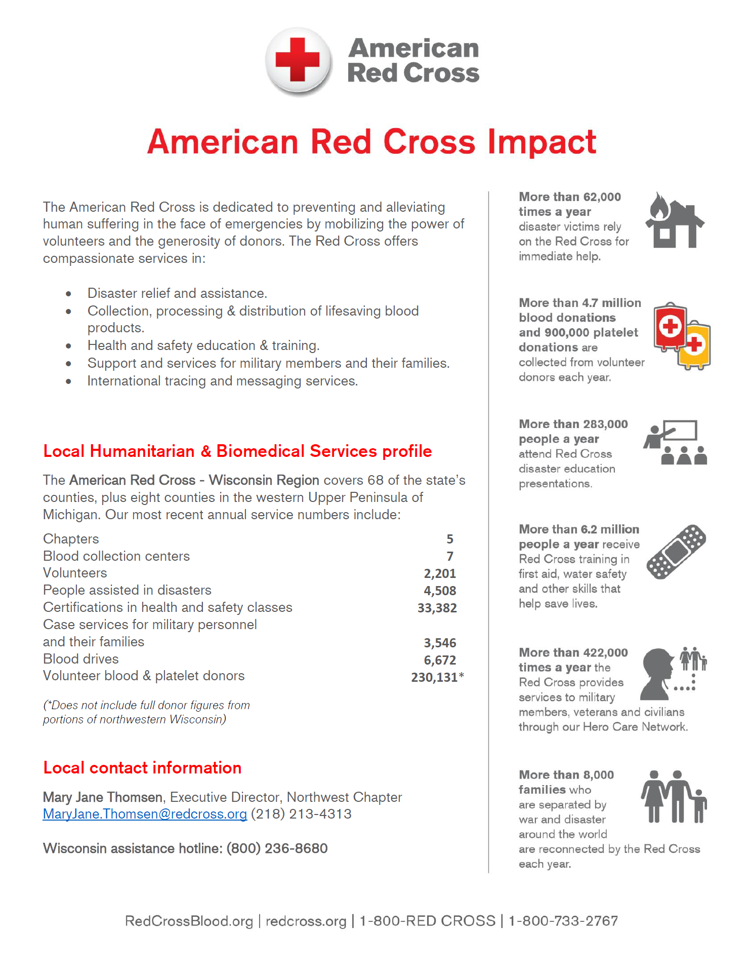 The mission of the American Red Cross is to prevent and alleviate human suffering in the face of emergencies by mobilizing the power of volunteers and the generosity of donors. The work of the Red Cross is vast and includes helping to provide funds to assist families who may have lost everything in a fire, offering life-saving CPR training, and helping military members and their families get the assistance they need. The American Red Cross Northwest Wisconsin Chapter serves 17 counties in Wisconsin. Last year, our Chapter responded to 76 local disasters, installed 997 smoke alarms, and collected 30,539 units of blood.