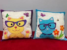A set of two adorable hand made cat pillows. Approximately 1 foot square each.