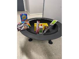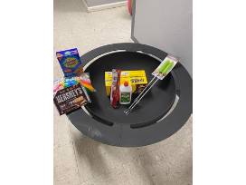 Steel fire pit measures 38" across and 16" high, package includes the makings for s'mores, roasting forks, fire starter log, lighter and lighter fluid
