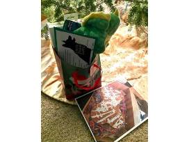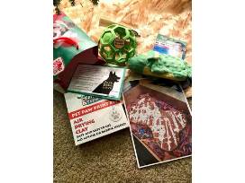 Gift bag with goodies including toys and a gift certificate for a 1 layer, bone shaped doggie celebration cake, approx 12" long.