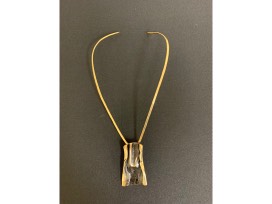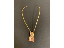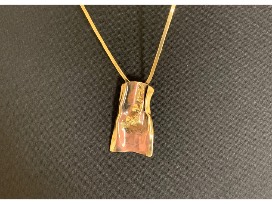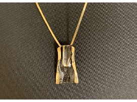 A gold slide with two pendants by Earth and Sky Jewelry.