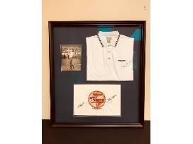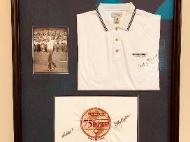 Framed and autographed Bobby Nichols 1964 PGA Champion Memorabilia: (1.) Picture as he makes winning putt (2.) Firestone Country Club Autographed flag (3.) Firestone Country Club Autographed golf shirt.