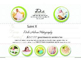 A gift certificate for a hair cut and style with Jessica White at The Loft at Hubbards, expires 2/2023 and a $50 gift certificate towards a session fee with Dede Holman Photography (expires August, 2022).