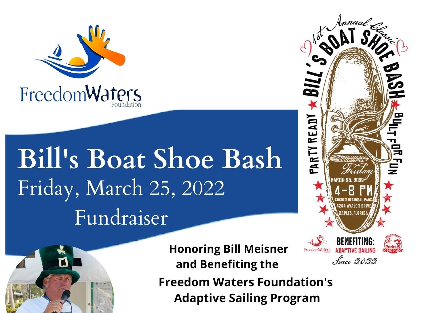 Bill's Boat Shoe Bash is fundraiser to benefit Freedom Waters Foundation's Adaptive Sailing Program, in honor of Bill Meisner, beloved sailing instructor and friend to all. A phenomenal and respected instructor, Bill took great pride in all the students he mentored over the years. He always greeted everyone with a big smile and open heart. Bill taught many of all abilities, to sail in our community and even went on to teach children of some of the original kids he taught years ago. Bill's Boat Shoe Bash honors our dear friend by benefitting the adaptive sailing program and will kick off the weekend of the Murdo Smith Regatta.