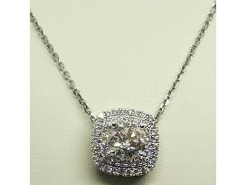 - Beautiful 14-karat white gold diamond pendant necklace featuring a brilliant round-cut diamond weighing 1 carat, surrounded by a double halo of brilliant round cut diamonds weighing .30 total carats. Click here for a high resolution image.