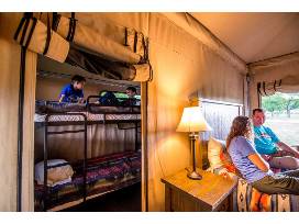 Luxury Deluxe Tents are designed to make the outdoors comfortable for the whole family. Each Luxury Deluxe Tent contains high-quality linens, bedding, and furniture. Each Luxury Deluxe Tent has one queen bed and two sets of bunk beds, sleeping for 5 to 6 people. These tents are a short walk away to our Shower house. A front porch with adirondack chairs provide a comfortable place to relax and enjoy the incredible scenery.
