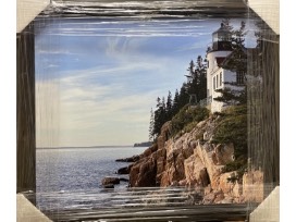 This framed canvas features the cliffside Bass Harbor Head Lighthouse in Acadia National Park, located in the village of Bass Harbor within Tremont, Maine. The lighthouse marks the entrance to Bass Harbor on the southwestern side of Mount Desert Island. The lighthouse was built of brick in 1858 on a stone foundation, stands 56 feet above mean high water.