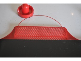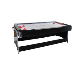 - A Harvard Dual Play II air hockey and billiards table. The table features a rotatable surface with an electric white air hockey table on one surface, and a billiards table with red baize play surface to the other. It is marked with cautionary instructions on how to properly flip the table's surface. The table is presented with three air hockey pucks and strikers.