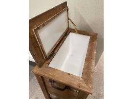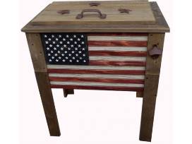 - Wooden cooler features a painted American Flag with rustic finish