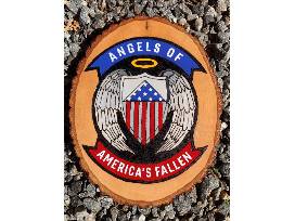 - This is a 13" x 10" live edge wood piece with a hand burned logo of the Angels of Americas Fallen.