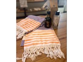 This package includes two 100% authentic Turkish Cotton Beach Towels, a bottle of Lavender Eau De Cologne, and a family-produced award-winning extra virgin olive oil.