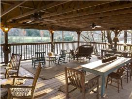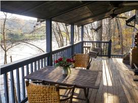 Located on the Clinch River 30 minutes from Knoxville, this peaceful retreat featured in Southern Living Magazine boasts an 8-acre waterfront property. The compound includes two separate homes -- with 2 bedrooms each, plus a sleeping loft and wood burning fireplaces -- and a riverfront outdoor pavilion, perfect for yoga or morning coffee with a stone fireplace, ceiling fans, table for twelve, TV, rockers and a beer fridge.