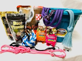Basket includes blue neck rope , pink 4 knot side pull halter, blue and white reigns, purple and black halter with 14 ft training line. All taco made by Ridge Creek Tack.