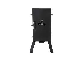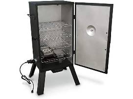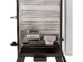 Three chrome-coated smoking racks. Thermostat temperature control for even consistent smoking. Built-in temperature gauge. Includes recipe booklet and quick start guide. Adjustable door latch. Wood chip tray slides out for easy ash removal. Removable water pan add moisture and flavor. Front grease tray catches food drippings.