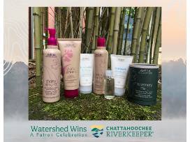 - A gift basket full of Aveda products: Cherry Almond shampoo, conditioner, body wash, stress fix composition oil, hand and foot relief moisturizing crème, and an invigorating rosemary mint vegan soy wax candle.