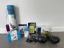 Fitness Package: Gaiam yoga strap, Fila boxing gloves, Gaiam workout stratech bands, Fila push up bars, Fila glding disks, Fila yoga block, Fila yoga mat, Fila work out gloves, Fila running armband for phone