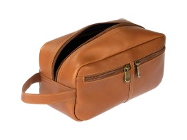 The Rio is a necessity for keeping all your toiletries in one place. It looks good sitting on a counter and can be easily tossed in your luggage for spur of the moment road trips. The bag is crafted from top grain Colombian cowhide leather in saddle tan with a durable mocha brown nylon lining. It is accented with antique brass-finish hardware.