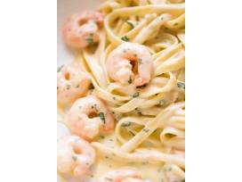 Handmade Tagliatelle with shrimp in a white wine cream sauce