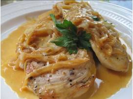 Your entree will be Gaston Gerard Chicken (braised chicken with a dijon, wine and cream sauce), served with fresh, handmade egg noodles and butter poached asparagus.