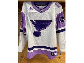 Bid on #48 Scott Perunovich's warm-up worn Hockey Fights Cancer jersey from warm-ups of the Blues vs. Vegas Golden Knights game on November 22, 2021.