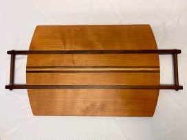 This tray is handmade with cherry and walnut wood harvested from private property in Marcellus, MI. The raw wood is cut to size so each piece is exactly the same, planed, joined with glue, and finally sanded. A finish coat of bees wax and food grade mineral oil is applied. The tray should be cleaned with a damp cloth and the wood nourished monthly with food grade mineral oil.